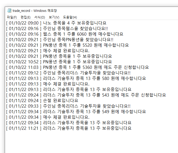 15시 30분까지 해당 과정을 반복하고 매수, 매도, 종목 선정 등 중요한 사항들의 출력내용은 record.txt 파일에 저장한다.