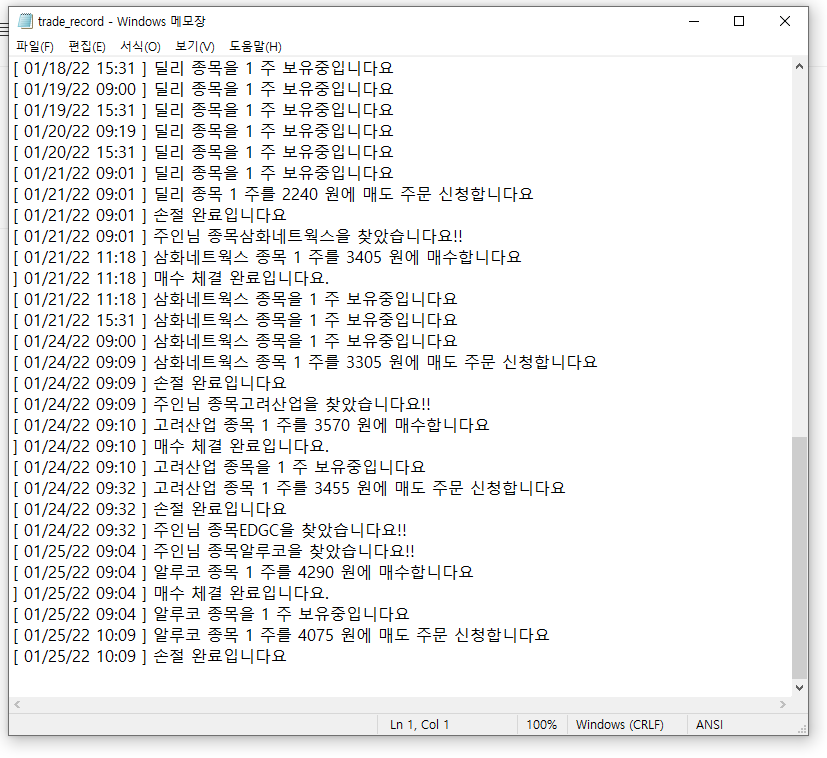 그래서 아침에 코드를 돌려놓고 출근을 하고 퇴근 후 메모장을 열어 어떤 거래를 했는지 확인합니다.