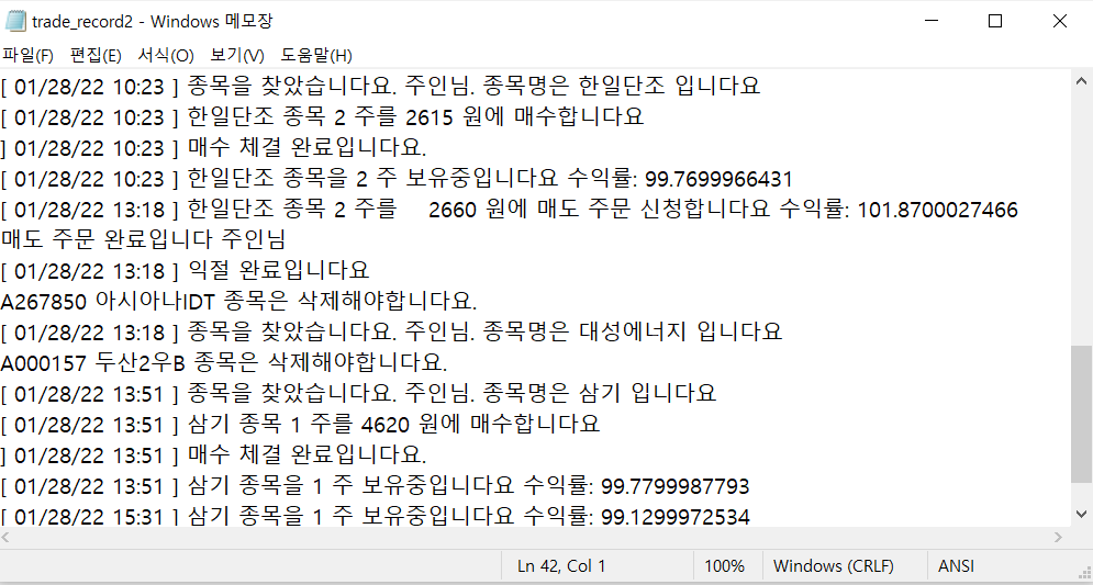 2-1. 보유종목이 있을 경우 매도 감시를 수행한다. 종목 수익률 기준 (1.5%익절 5%손절 설정)