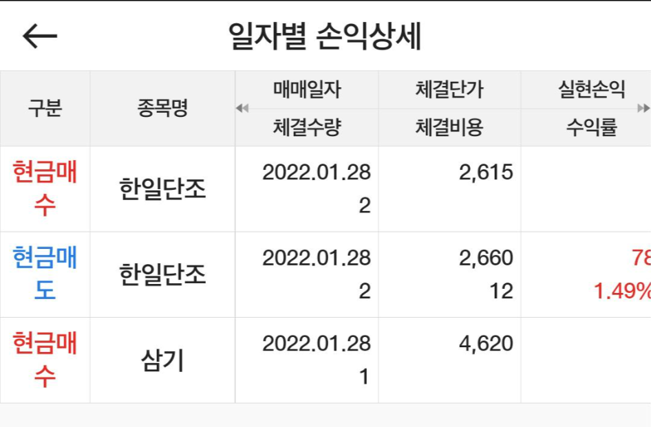13시 18분- 한일단조 / 2,660원 2주 매도 주문 / 체결 완료 /수익률 1.49%