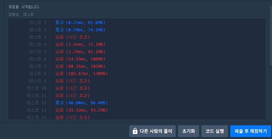 테스트 1,2가 통과되어 성공했다고 생각했으나 테스트 24까지 추가 검증 결과 정확성 25%로 처참한 성적을 받았습니다.