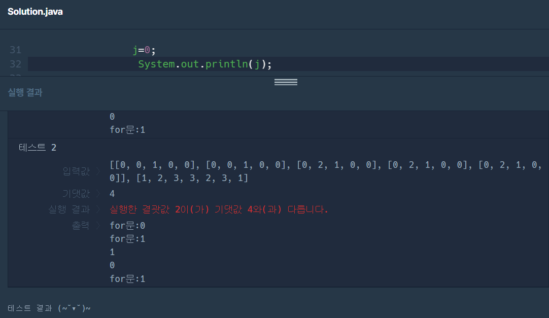 for문 안에서 j를 0으로 초기화하였는데 j는 1부터 시작을 하였음.