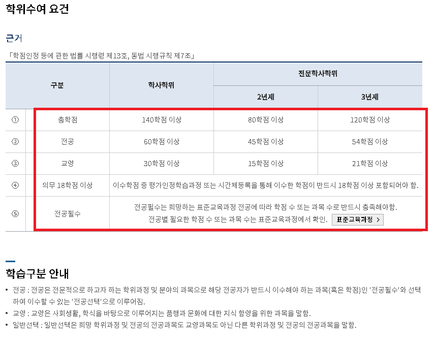 학사학위는 총 140학점 , 2년제는 80학점, 3년제는 120학점이 필요합니다.