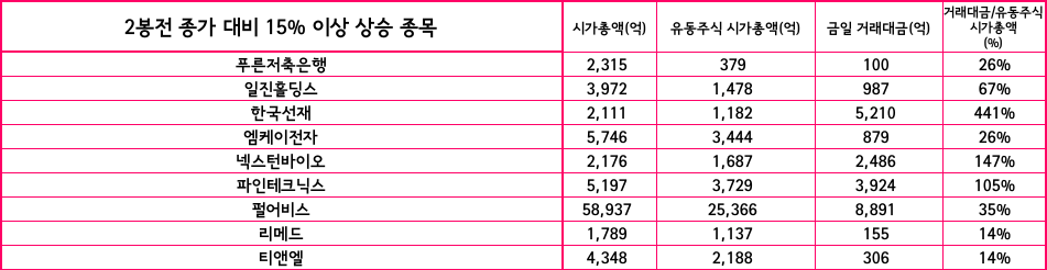 4. 2봉 전 종가 대비 15% 이상 상승 종목 ( 시가총액, 유동주식 시가총액, 금일 거래대금)