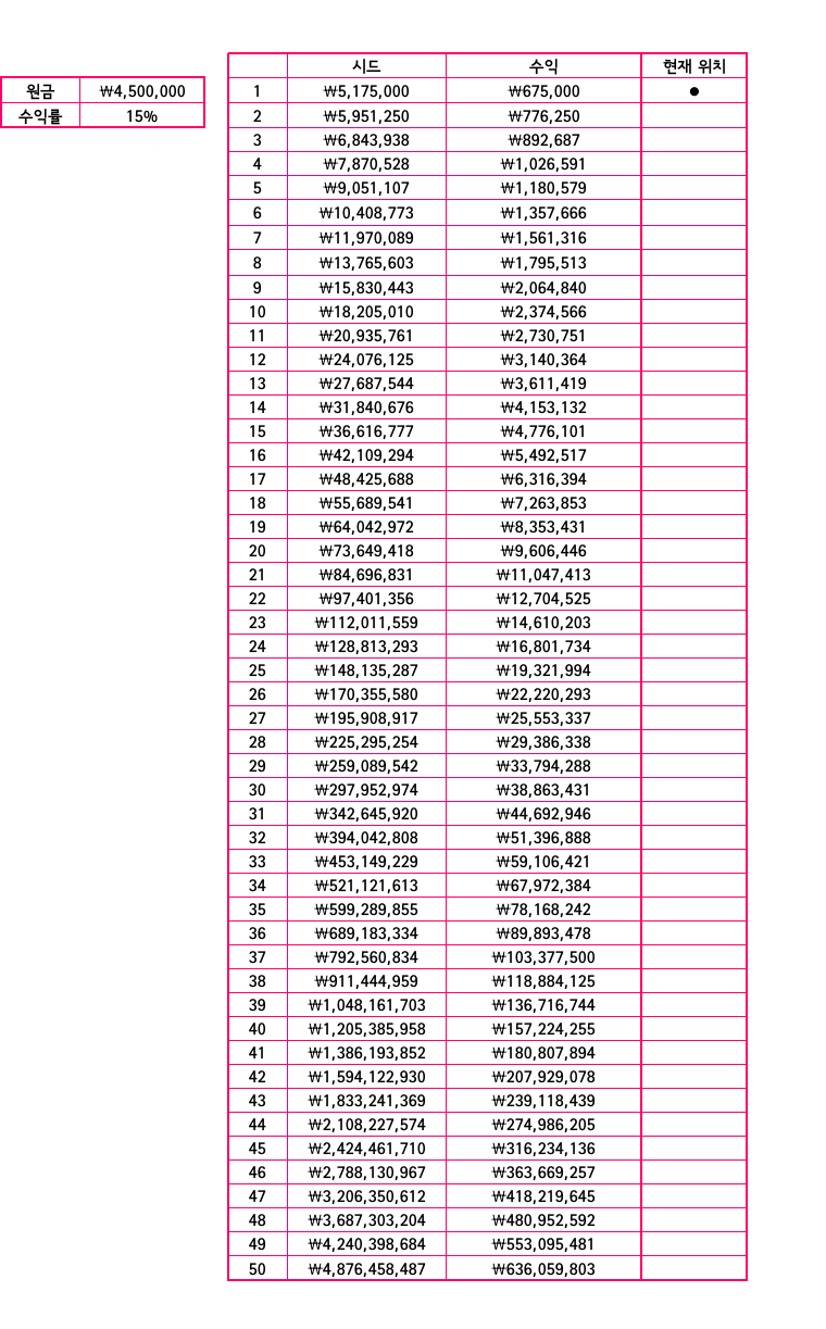 15%씩 50번의 수익을 낸다면 이론상 시드머니는 1,083배로 불어남.