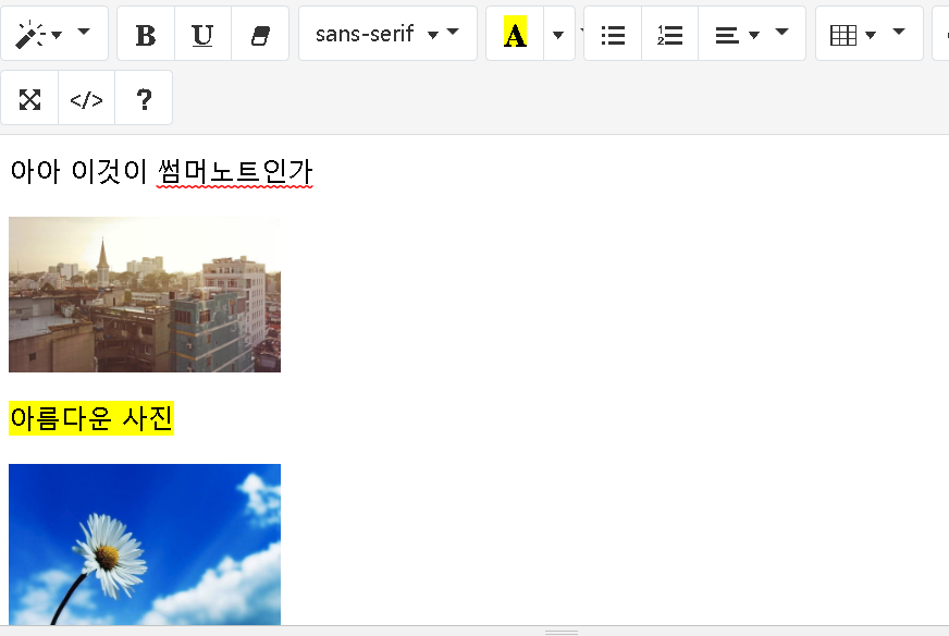<p>아아 이것이 썸머노트인가</p><p><img style="width: 25%;" src="/resources/image/summerImageFiles/20220918162246.png"></p><p><span style="background-color: rgb(255, 255, 0);">아름다운 사진</span></p><p><img style="width: 25%;" src="/resources/image/summerImageFiles/20220918162312.png"><br></p>