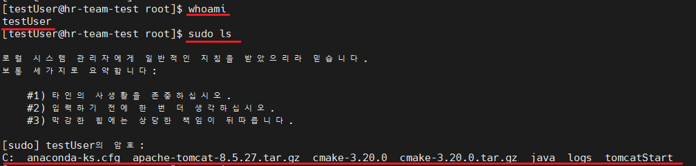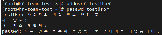 testUser라는 계정을 생성하고 wheel그룹에 넣어 sudo 명령어를 사용할 수 있게 해보자.