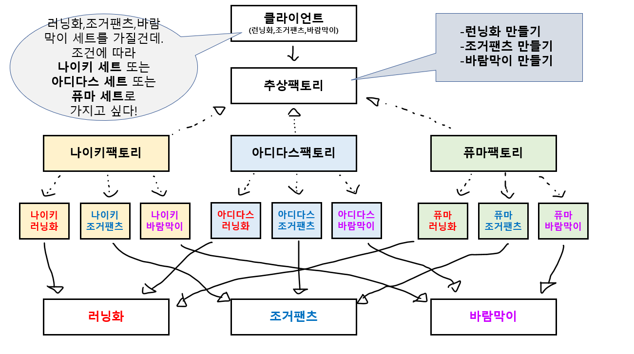 2) 클라이언트는 추상 팩토리의 기능을 사용한다. 이 때 조건문 등에 따라 분기하여 추상 팩토리를 어떤 팩토리로 구체화 하여 사용할 지 결정한다.(나이키,아디다스,퓨마)