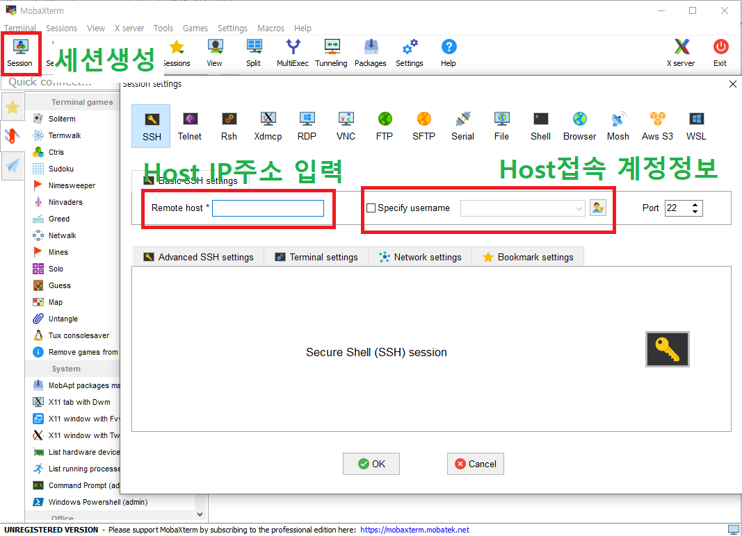 mobaXterm 세션 세팅 화면 - mobaXterm은 원격 접속을 위한 다양한 방식을 제공하고 있다.