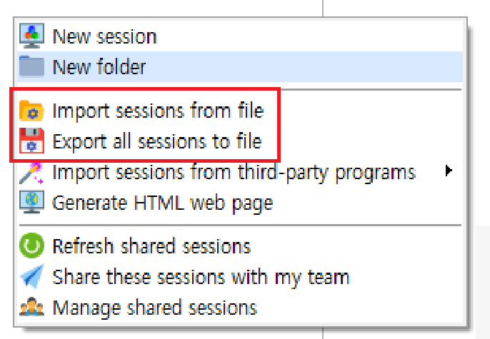 만들어 놓은 세션을 파일로 익스포트하여 공유하거나 세션파일을 임포트하여 추가할 수 있다.