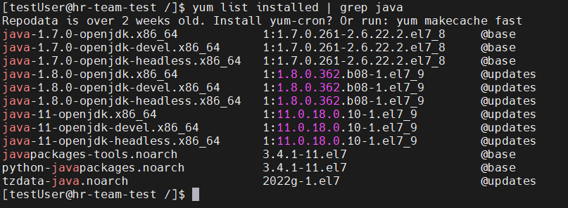 2) 설치 가능 패키지 확인 yum list | grep jdk