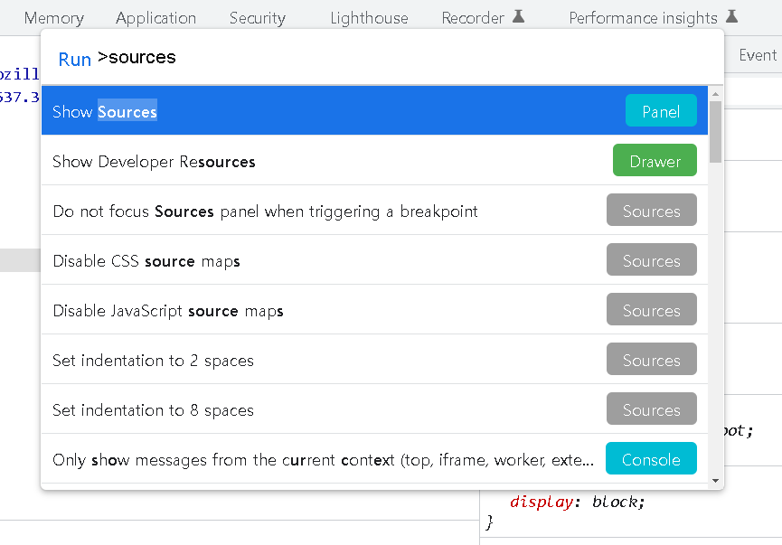 ex) sources, console 등 개발자 모드 내 기능을 찾고 실행하기 편리하다.