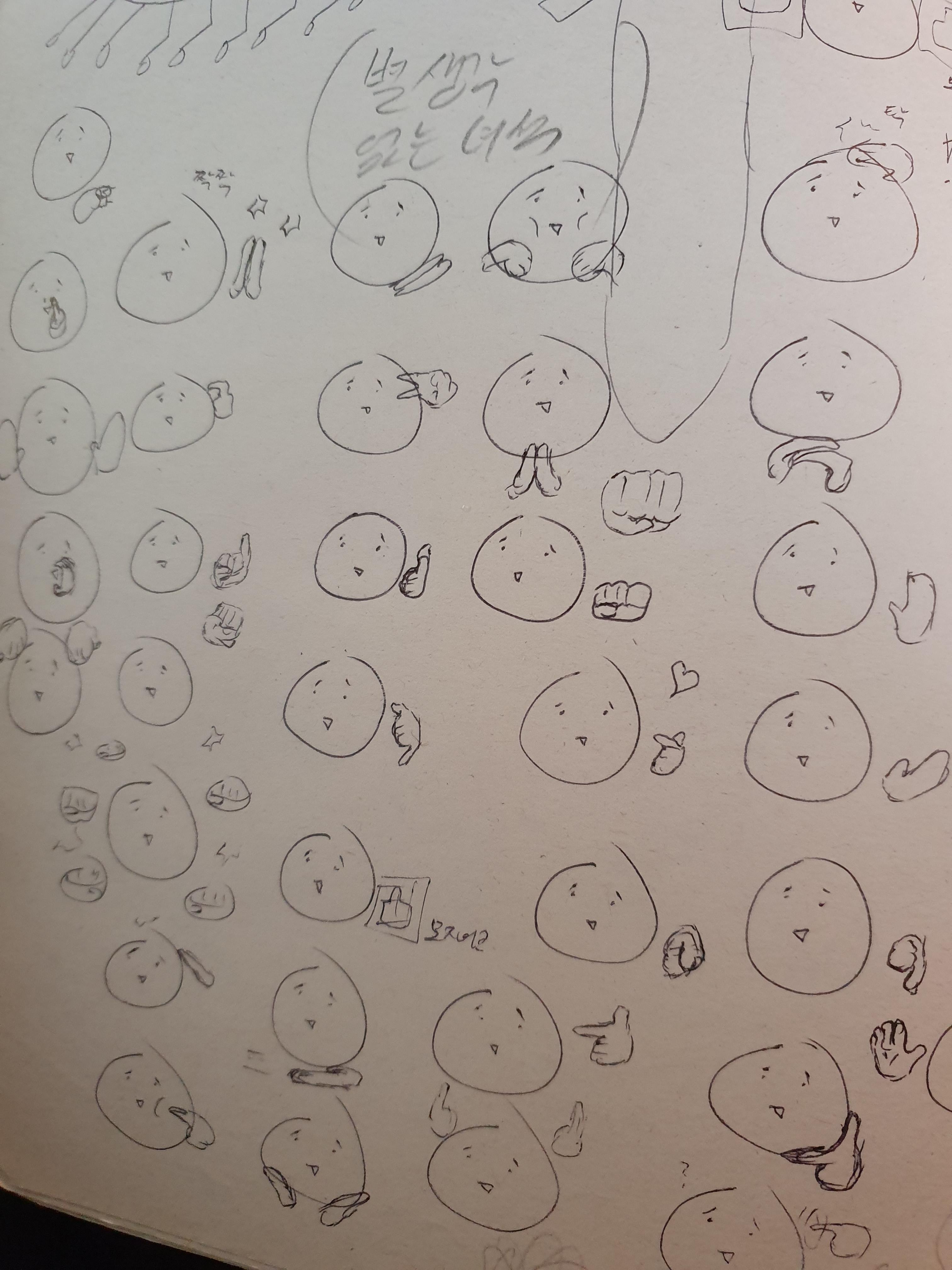 새로운 아이디어가 만들어지게 된 것입니다. 제스처의 종류도 대략 30개 남짓이 만들어졌기 때문에 곧바로 작업에 들어갔습니다. 아이디어를 실현하기 위해서 제가 할 일은 똑같은 얼굴을 만들어 복사를 하고 제스처를 그려 넣는 것이었습니다.