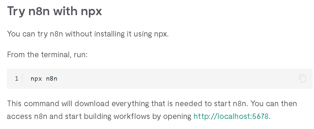▷npx를 이용해 설치없이 n8n을 이용하는 것도 가능하다. npx는 npm(Node Package Module)의 도구.