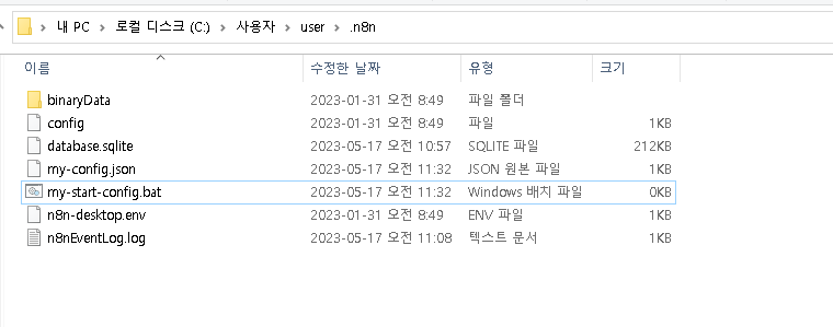 .n8n 경로에 컨피그파일(my-config.json)과 환경변수 세팅 및 n8n 실행 스크립트(my-start-config.bat)을 생성하고 내용을 다음과 같이 저장한다.