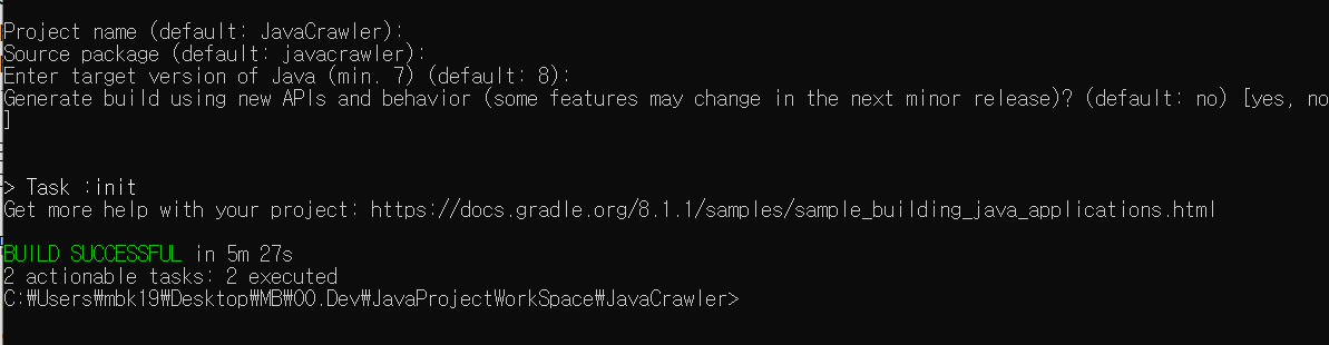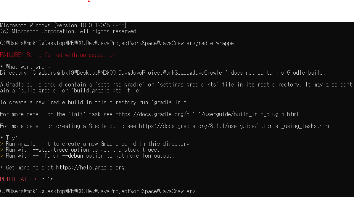 ㄴ. 프로젝트 루트폴더에서 gradle wrapper 명령어를 실행한다. 소스 공유 시 그레이들 설치없이 그레이들 명령어를 실행할 수 있게 해주는 기능이다.