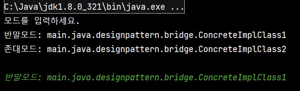 "반말모드: main.java.designpattern.bridge.ConcreteImplClass1\n" +