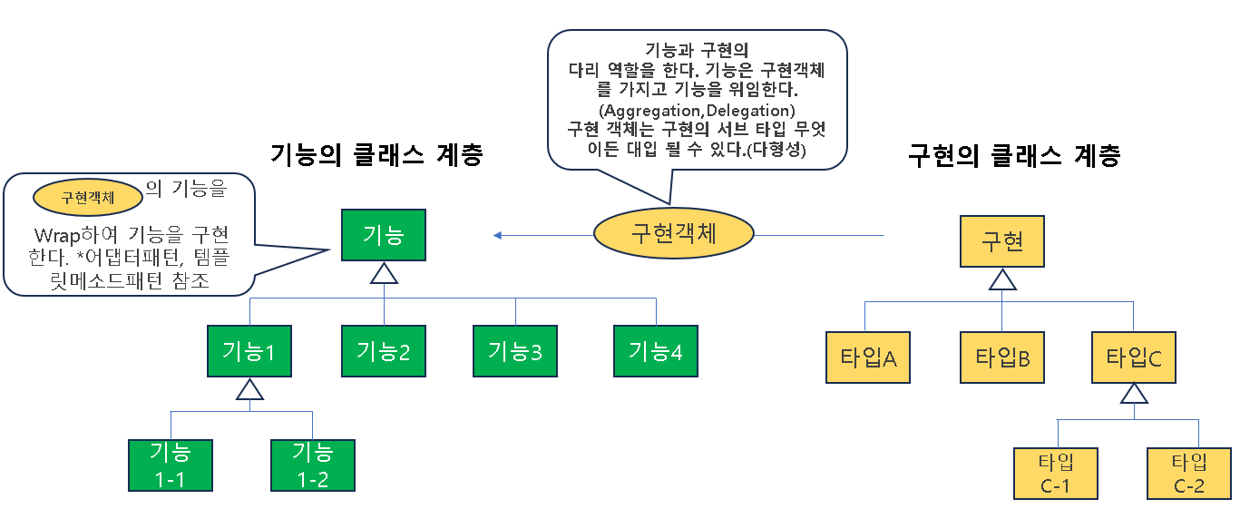 -기능의 클래스 계층과 구현의 클래스 계층, 즉 기능계층과 구현계층을 분리해두면 확장이 편리해진다.