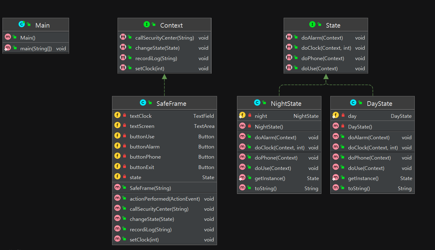 예제에서는 시간에 의존하는 금고의 기능 처리에 대해 다루고 있다. 주간과 야간이라는 두 가지 상태의 변화에 따라 금고의 기능은 다르게 동작한다. 상태 변화는 각각의 ConcreteState에서 수행하고 있다.