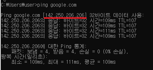 CMD에서 ping google.com 을 입력했을 때 DNS를 통해 입력한 도메인을 142.250.206.206이라는 IP주소로 치환하여 ping 명령어를 수행한다.