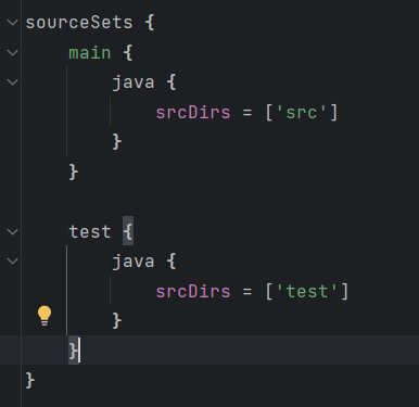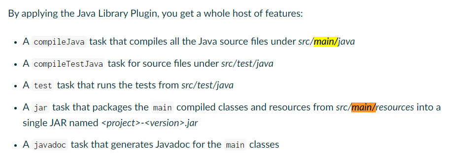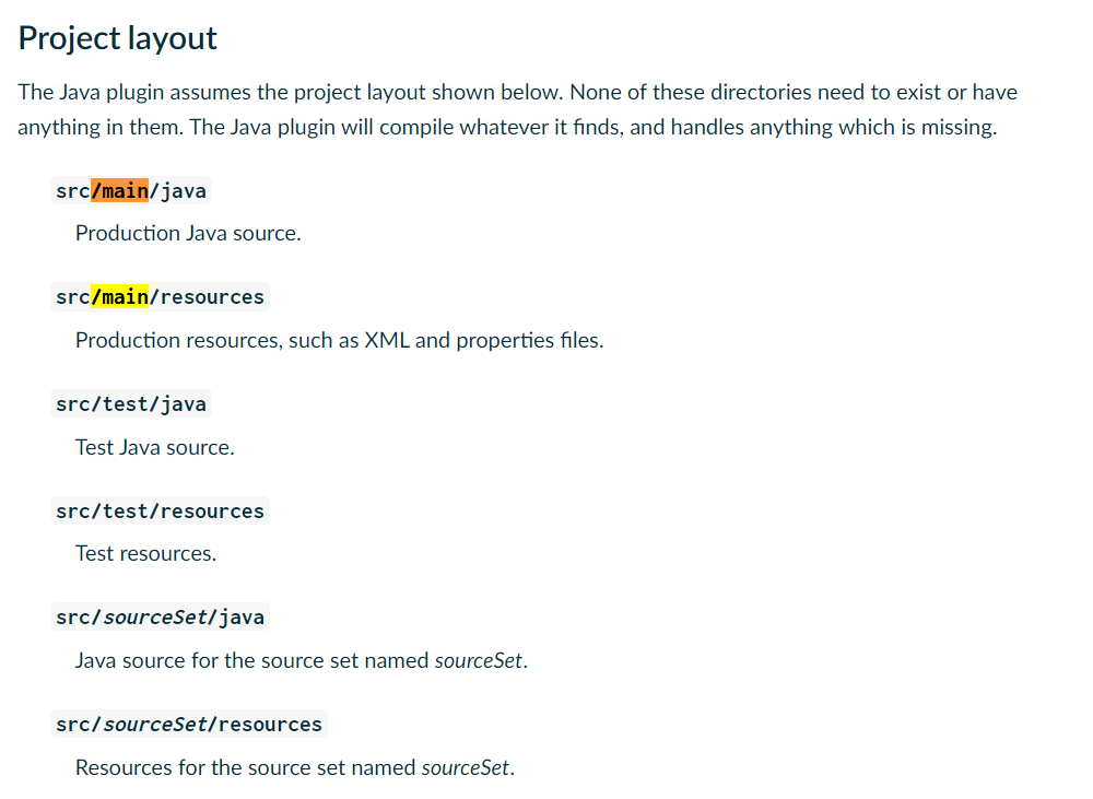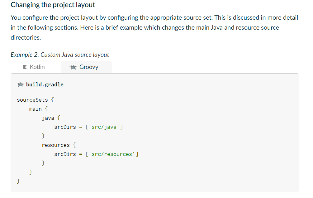 You configure the project layout by configuring the appropriate source set. This is discussed in more detail in the following sections. Here is a brief example which changes the main Java and resource source directories.
