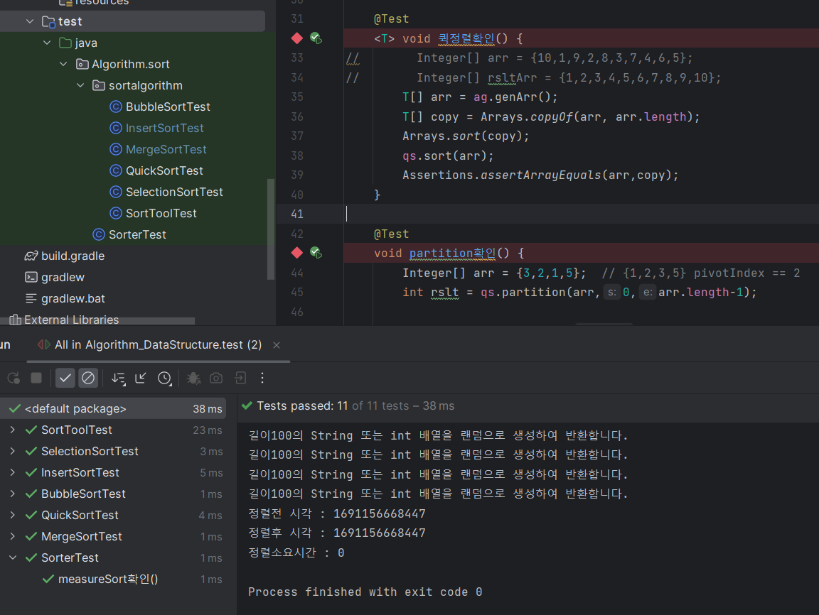 JUnit으로 점진적으로 유닛테스트를 해가며 직접 정렬 알고리즘을 구현하였고 디버깅을 적극 활용하니 굉장히 편리했다.
