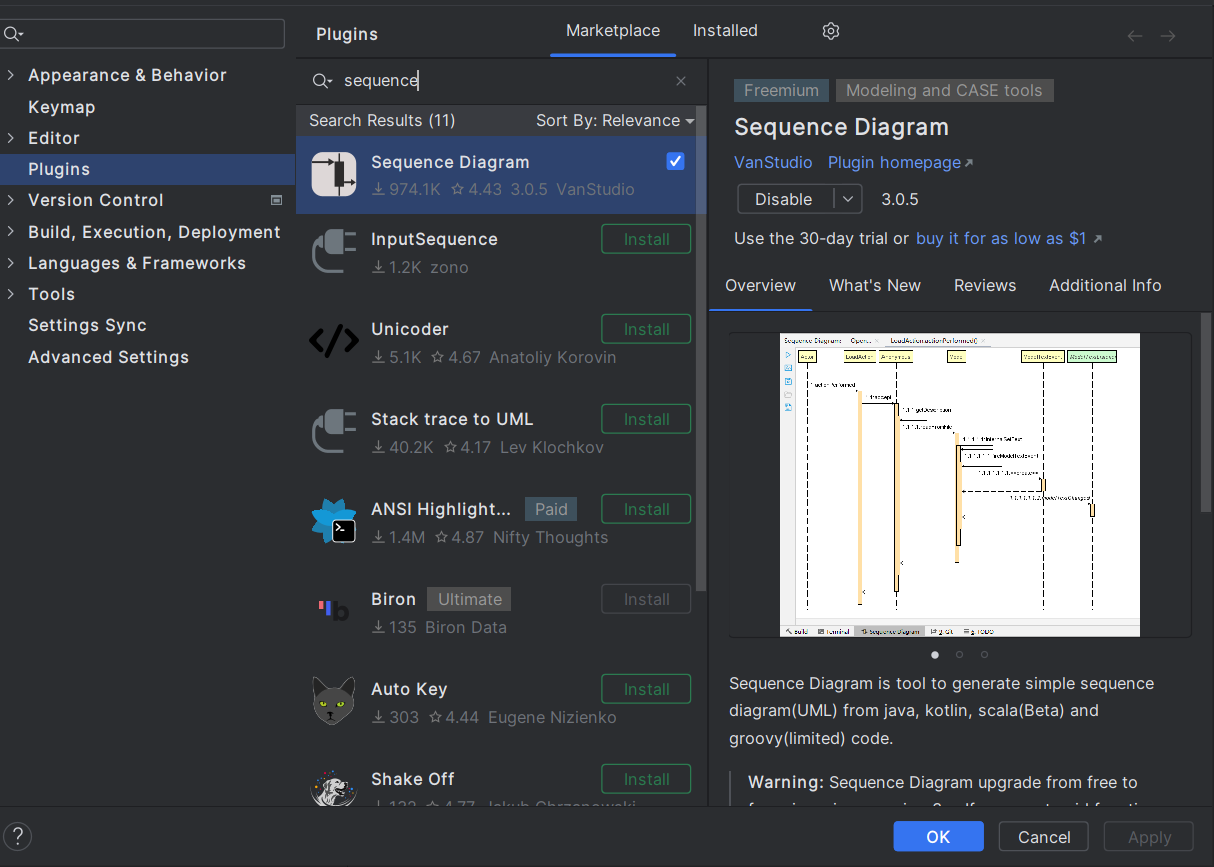 sequence를 검색하면 Sequence Diagram 플러그인을 설치할 수 있다.