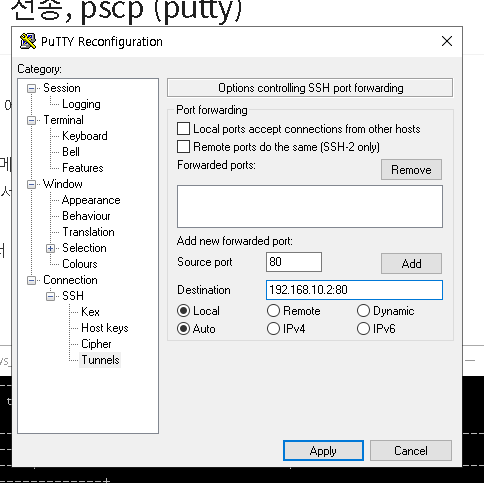 putty 터널링 설정으로 로컬에서 직접 목적 서버의 디렉터리로 전송이 가능할 것으로 생각하였다.