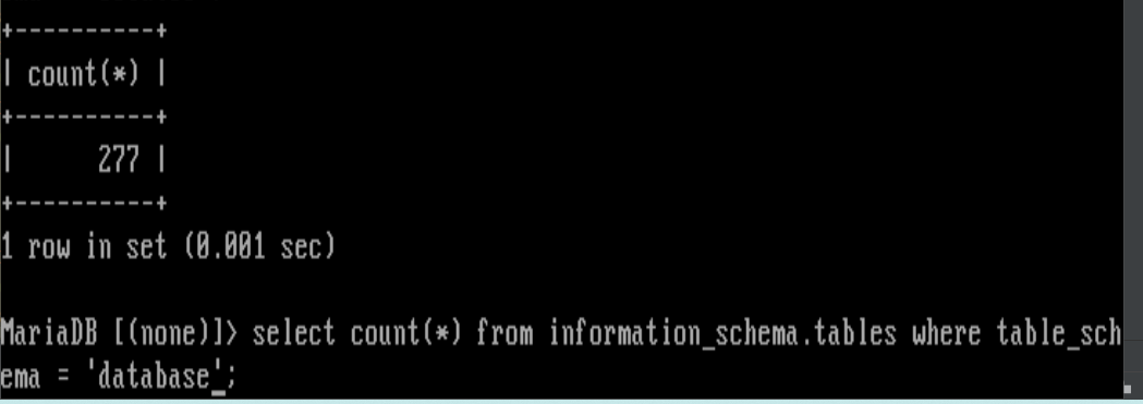 => 특정 데이터 베이스에 테이블이 몇 개 있는지 확인하는 쿼리, where 조건을 추가하면 특정 패턴의 테이블 이름을 갖는 테이블들이 몇 개인지 확인할 수 있다. ex) and table_name like '조건';