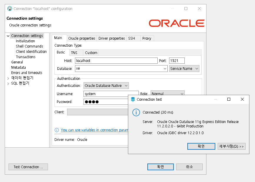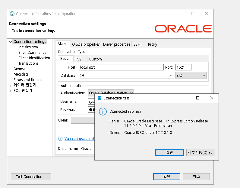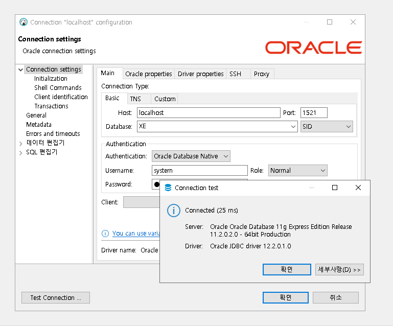 Oracle 11g Windows 버전을 설치한 후 Dbeaver 에서 커넥션 시 다음과 같은 에러가 발생하였다.