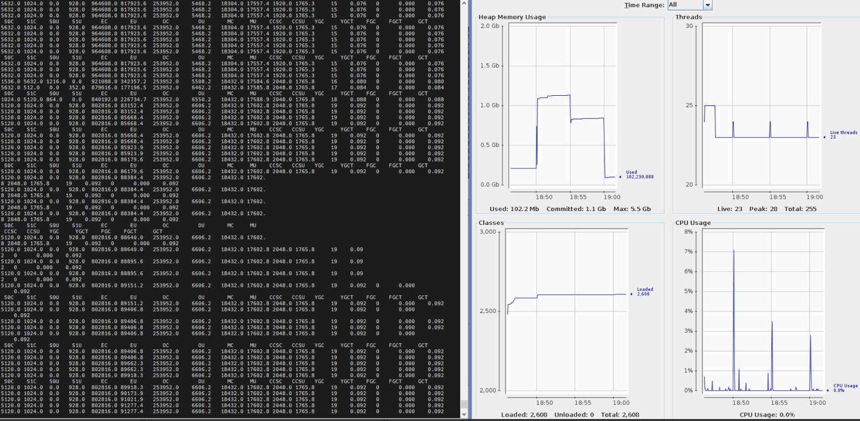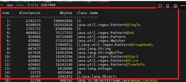 이렇게 heap 사이즈가 늘어나버리고, 늘어난 heap은 OS에 회수되지 않고, 하나의 배치 프로세스는 제법 큰 메모리를 점유하게 되는 것 같다. 소스 상에서 생성하는 int[], 정규표현식, 그리고 문자열을 유심히 확인할 필요가 있겠다. 그런데 여기서 어딘가 또 문제가 있다는 것을 알게 되었다.