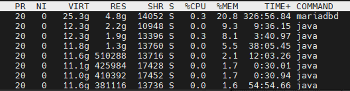 이번에 마주한 메모리 문제는 현재 진행형이다. 이틀 째 원인을 파악중이나 아직 근본 원인에 접근하지 못하여 오늘 밤에는 꼭 원인을 찾길 기원하며 머리를 식힐 겸 글을 쓰고 있다. 서버의 메모리 사용량이 90%에 임박한 케이스들이 보이고 있다. 그중 서버가 멈추는 등 문제가 발생하는 케이스도 있어 원인을 파악하는 중이다. 몇 개월 간 메모리 90%의 상태를 유지한 케이스도 있기에 이것이 정말 문제인가 메모리 누수의 관점에서 확인해 볼 필요가 있다. 그리고 서버의 한정된 메모리 안에서 우리의 솔루션이 지속가능하기 위한 권장 사양에 대한 정리가 필요하다고 생각했다. 데이터를 수집하는 대상 규모에 따라 똑같은 프로세스가 600MB에서 12GB에 육박하기까지 메모리 사용량에 차이가 발생했다. 5분 주기로 수행하는 배치에 의해 heap사이즈가 순간적으로 늘어나고, GC가 수행되더라도 JVM이 확보한 heap 메모리가 OS에 즉각적으로 회수되지는 않는 것으로 보였다. Xmx 설정이 없어 힙 사이즈의 적정 크기는 어느 정도이어야 할지 Xmx30m으로 매우 작게 힙사이즈를 설정해 보았다. 그러자 힙사이즈는 30mb 언더로 유지가 되었으나 DB세션이 제대로 클로즈되지 않는 등의 이상 증상이 발생하기 시작하였다. 예상한 것은 JVM의 OOM이 발생하는 것이었으나 프로세스가 죽지 않고 유지되었다. jstat으로 확인해 본 결과 배치를 수행하는 5분 주기로 FGC가 실행되는 것으로 보였다. 아직 JVM과 GC에 대한 지식이 부족하여 어떠한 원리인지 파악이 필요하다. 약 20여 개의 스케줄 된 배치 프로세스들이 각각의 JVM에서 실행된다는 것이 메모리 측면에서 큰 비용이라는 것을 이번에 알게 된 것 같다. 더군다나 적절한 Xmx 설정이 없으니 default로 heap이 가질 수 있는 최대 사이즈가 물리 메모리의 약 1/4라는 인터넷에서 확인한 정보에 의하면 언제든지 OOM이 발생해도 이상하지 않은 상황인 것이다. heap사이즈가 늘어나는 시점에 어떤 객체가 생기고 있는 것일까 궁금하여 jstat과 heap dump를 활용하여 보았다. 놀랍게도 가장 많은 메모리를 차지하는 것은 int []이었다. int []이 약 400MB 가까이 heap 메모리를 차지하였다가 GC 되었다. length가 긴 int 배열의 용량이 얼마나 큰 지는 프로그래머스 코테 연습을 하면서 익히 알게 되었었다. int가 4byte인데 Integer.MAX_VALUE만큼의 int 배열을 선언해 보니 메모리 부족이라는 문구가 발생했었다. 대략 4*21억 바이트인 것이다. 이렇게까지 긴 int []은 없었지만 개수가 많았다. regex, char []과 String이 그다음을 이었다.