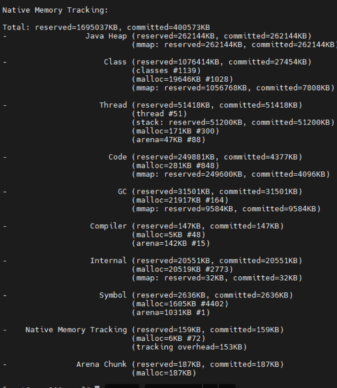 native_memory를 확인해보았다. 의아하다. 뭔가 숫자가 딱딱 들어맞질 않는다. Total committed와 RES가 다르다. JVM이 사용하고 있는 전체 메모리와 운영체제의 top 명령에서 확인할 수 있는 RES가 왜 다른 것일까. 왜 OS에서는 JVM의 용량을 더 크게 알고 있는 것일까. 세탁기가 다 돌아간 관계로 빨래를 널고 원인 파악에 들어가 보아야겠다. 오늘 저녁에는 Java 스트림을 연습할 계획이었는데 메모리 이슈를 파악하는 것도 재미있는 구석이 있는 것 같다. 정말 메모리는 중요하고 컴퓨터의 한정된 자원을 잘 활용하는 것, 문제가 발생하였을 때 근본 원인을 파악하여 조치하는 것 또한 정말 중요하다고 생각한다. 현 직장을 다니면서 네트워크와 운영체제에 대한 기본기, 그리고 영어와 수학, 무엇이든 원리를 제대로 깊이 있게 알고 넘어가는 것이 여러 가지 문제 해결의 양분이 된다는 것을 느끼고 있다. 조급할 시간에 천천히 하나라도 제대로 익히는 개발자가 되어야겠다!