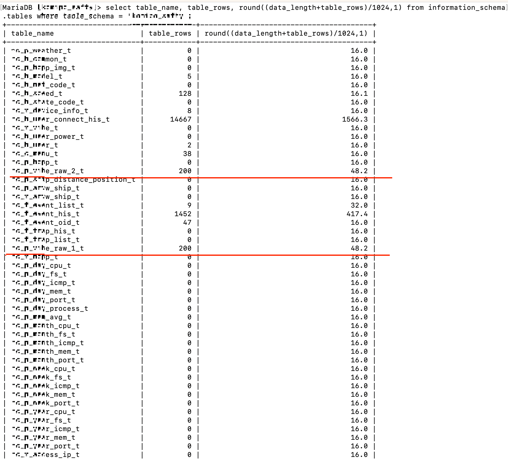 select table_name, table_rows, round((data_length+table_rows)/1024,1) from information_schema.tables where talbe_schema='db'