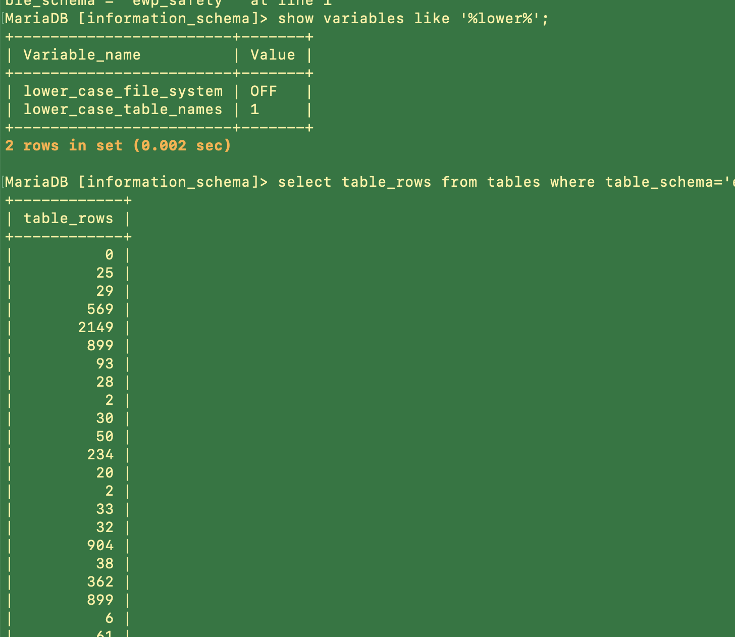 8) my.cnf 설정 적용 확인: show variables like '% lower%';
