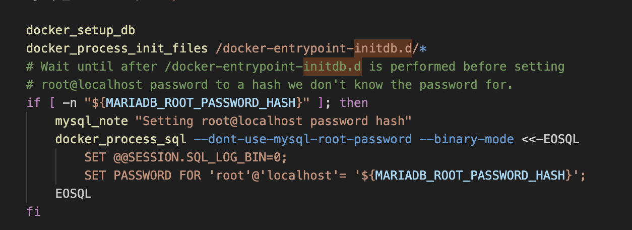 ENV를 이용한 데이터베이스 생성에 있어서 한 가지 아쉬운 부분은 ENV로 한 개의 데이터 베이스만 생성할 수 있다는 점입니다. 그 이유는 아래와 같이 docker-entrypoint.sh 파일에서 MARIADB_DATABASE 환경 변수를 복수로 지원하지 않기 때문입니다. 해당 셸 스크립트에서는 MARIADB_DATABASE 환경변수가 있을 경우 CREATE DATABASE 문을 수행합니다.