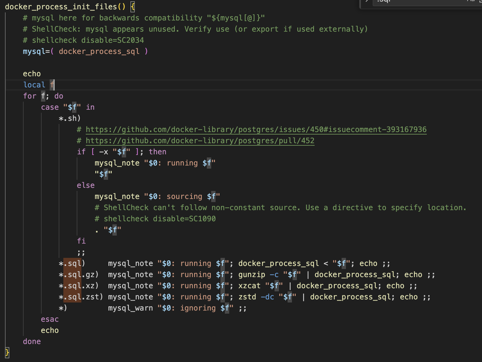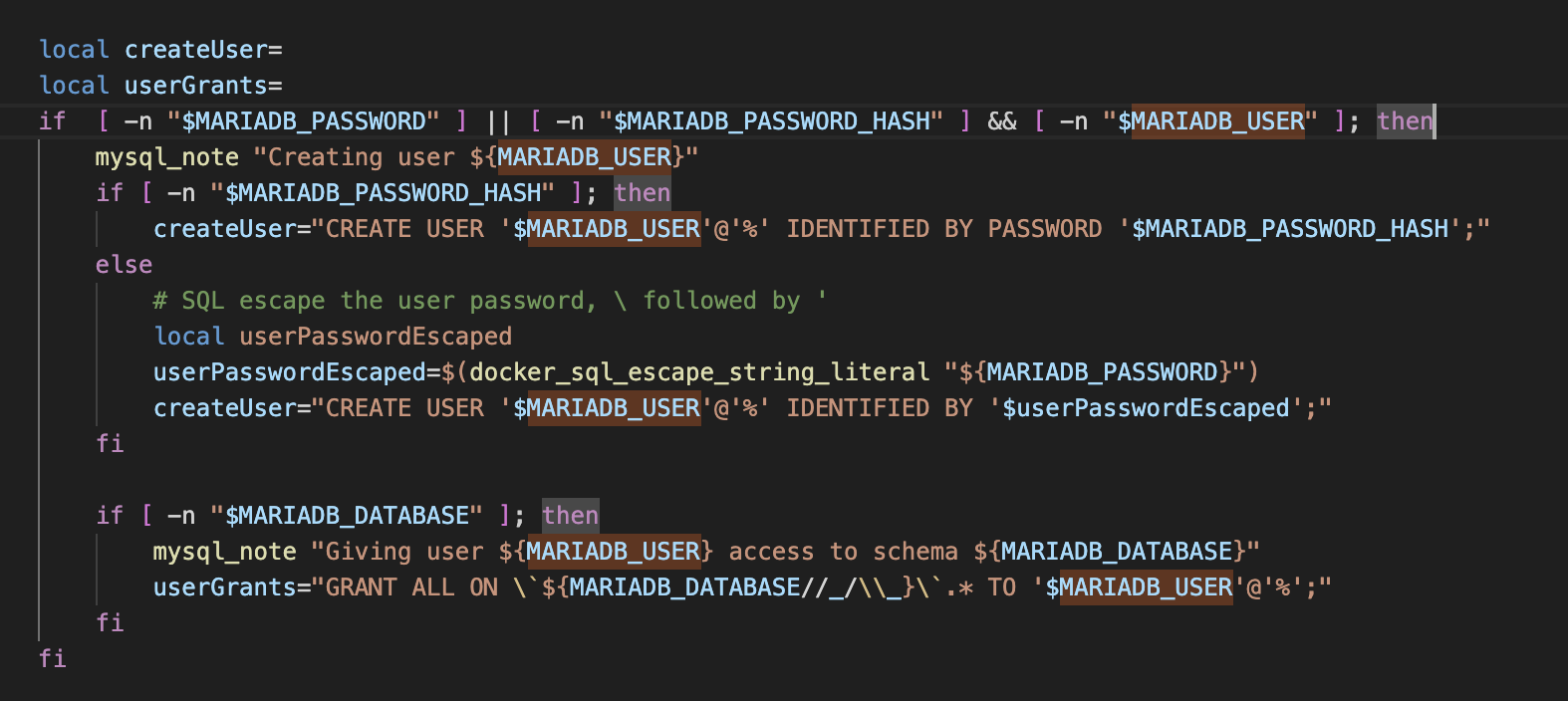 아래는 컨테이너의 /usr/local/bin/docker-entrypoint.sh 를 docker cp로 꺼내어 VSCode로 열어본모습입니다. Dockerfile에서 설정한 환경변수(ENV) 중 MARIADB_USER로 검색을 해보니 사용자를 생성하는 CREATE USER 문이 보입니다. 컨테이너에 설정한 환경변수(ENV)를 이용하여 컨테이너 내에서 가동되는 프로세스의 세팅을 해주는 것입니다. (비슷한 예로 DB접속 정보를. ENV 파일에 설정하는 방법이 있습니다.)