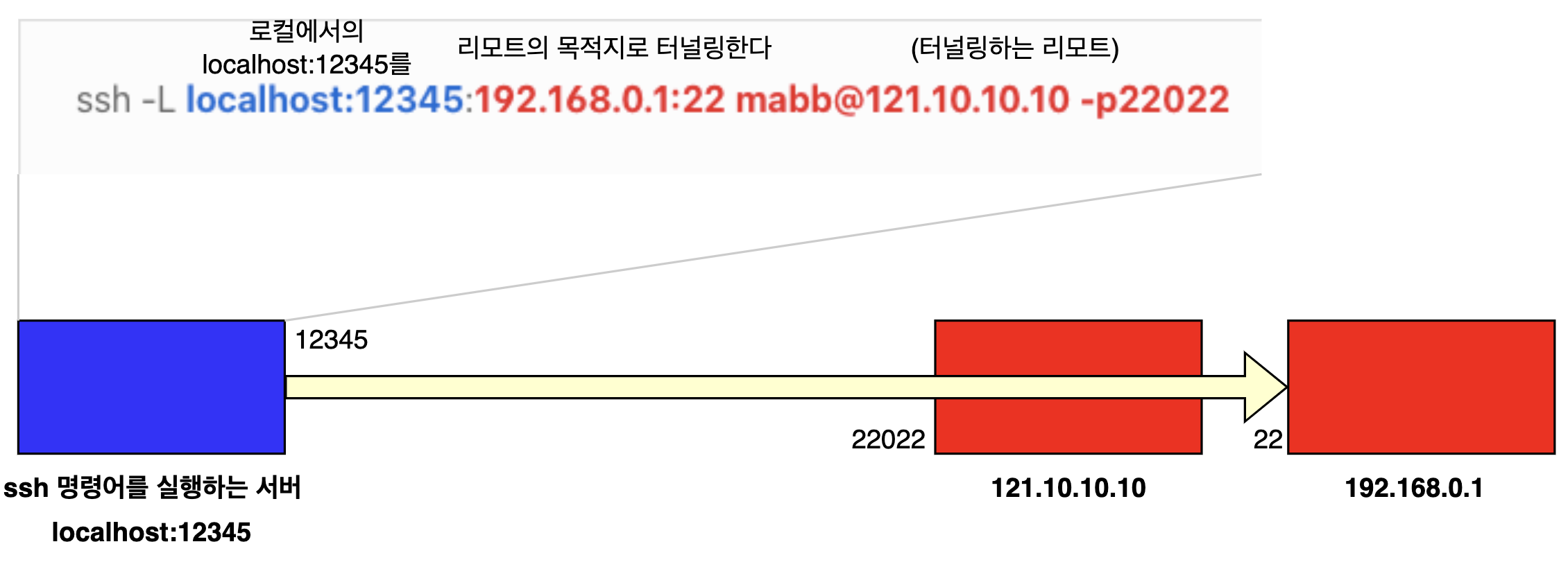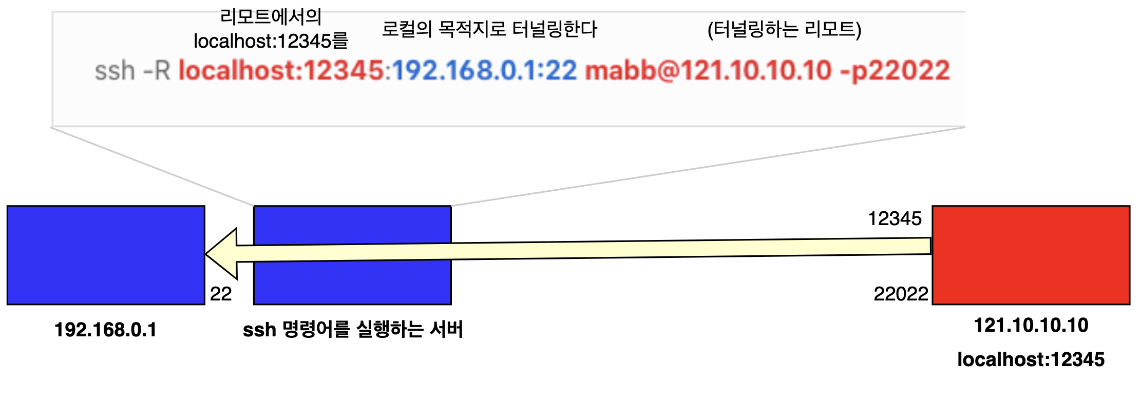 121.10.10.10 서버가 ssh 명령어를 실행하는 현재 서버의 입장이 되게 합니다. 리모트 서버에서의 localhost:12345를 현재 서버에서 접근할 수 있는 192.168.0.1:22로 터널링 해줍니다.