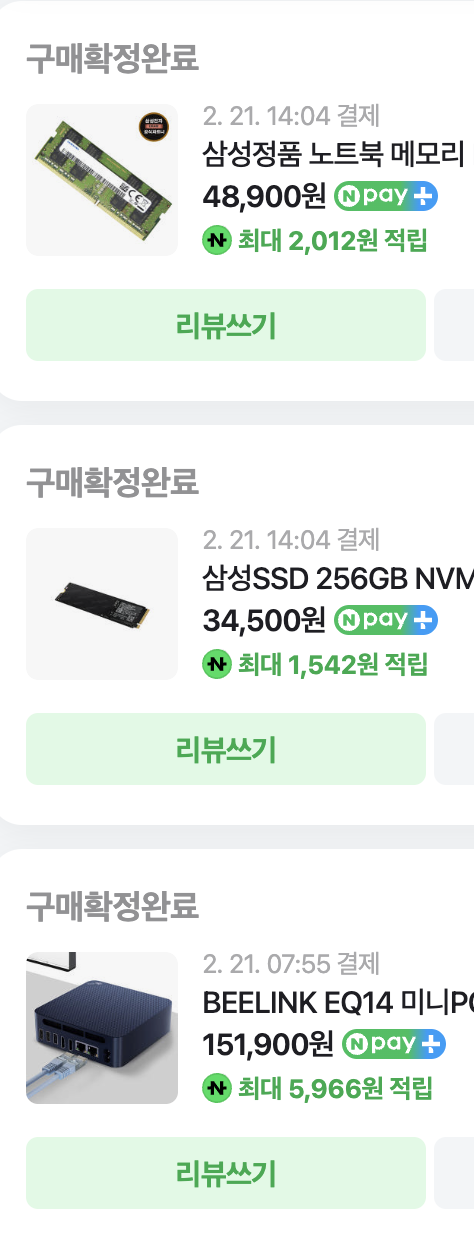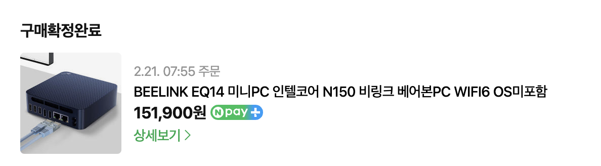 집에 서버를 두고 싶다는 생각만 1년 정도하다가 미니 PC를 구입했다. 인텔 N150 베어본을 151,900원에 구입하고 256GB SSD 34,500원, 16GB 메모리 48,900원으로 235,300원이 들었다. ( 네이버포인트 9,520원 쌓였으니 225,780원 들었다. )