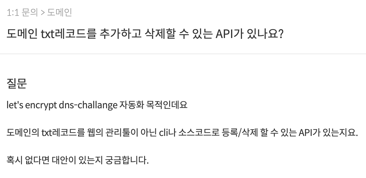 TXT 레코드를 추가/삭제하는 API를 제공하는지 가비아에 문의를 남겨 놓고 답변을 기다리는 중이다. 위의 계획은 제공하는 API가 없을 것이라는 가정 하에 방법을 찾아보려는 시도이다.