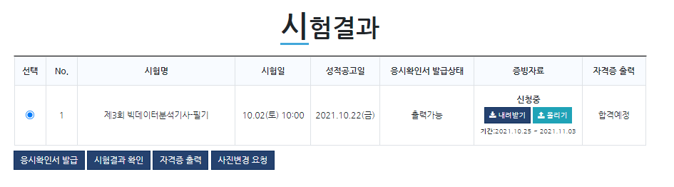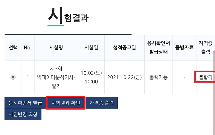지난 10월 22일, 10월 2일에 보고 온 빅데이터 분석기사 3회 필기시험의 결과가 나왔습니다. 필기시험 결과가 몇 시에 나오는지 몰라서 날이 바뀌는 자정에 한 번, 그리고 오전 9시에 한 번 떨리는 마음으로 조회를 하였으나 결과가 나와있지 않았습니다. 체감 난이도가 높아서 불합격이라고 생각하며 20일을 기다렸습니다만 떨리고 조마조마한 것을 보니 은연중에 기대를 하고 있었나 봅니다. 시험 결과는 10시에 공지된다고 하여 떨리는 마음으로 한 시간을 더 기다렸습니다. 그리고 오전 10시, 가슴을 조리며 '시험 결과' 버튼을 클릭하였는데
