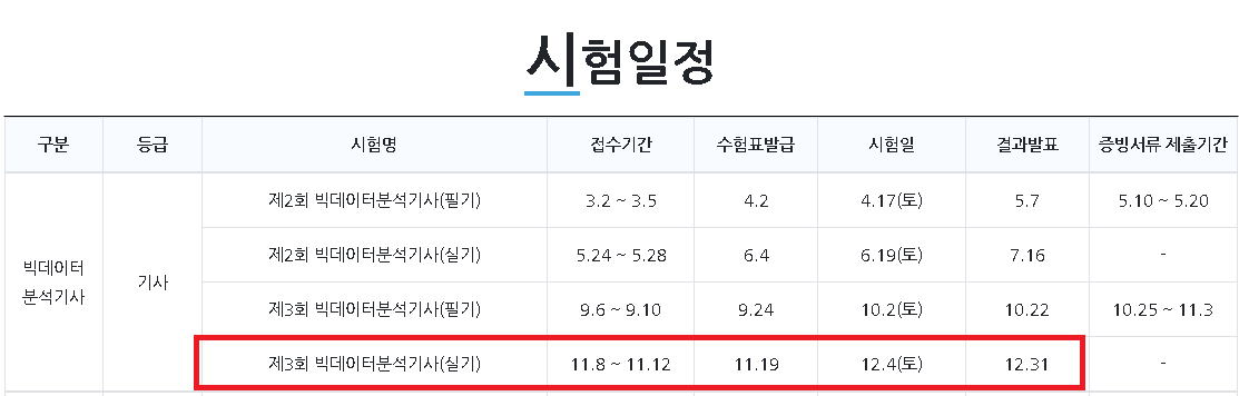 다음은 빅데이터 분석기사 3회 실기시험의 일정입니다. 11월 8일부터 11월 12일 사이에 접수를 하고 11월 19일에 수험표를 발급받아 12월 4일에 시험을 보게 됩니다. 실기시험도 필기시험처럼 시험과 결과 발표의 텀이 길어 정신적으로 힘든 시기를 보낼 것으로 예상이 됩니다. 실기시험은 필답형과 실제 프로그램인 R 또는 파이썬을 다뤄야 합니다. 비전공, 직무 무관자에게는 정말 어려운 시험이 될 것 같아 걱정이 되면서도 한편으로는 한 달 정도 남은 사이에 제가 어느 정도까지 발전할 수 있는지 기대도 됩니다. 실기시험까지 잘 마치고 한 단계 더 성장하길 바라며 이만 포스팅 마치도록 하겠습니다.