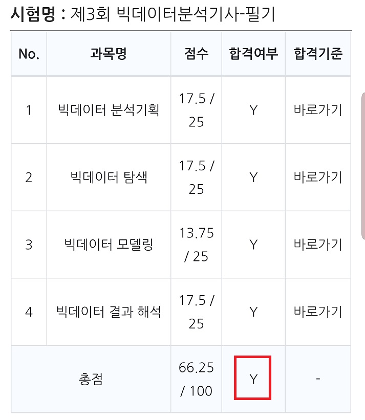 밖에는 불합격이라고 표시되어있는데 점수는 66.25점이고 합격여부는 Y로 표기가 되어있었습니다. 빅데이터 결과 해석 과목의 가채점 결과는 25점 만점 기준 11.25점으로 과락을 겨우 면하는 수준이었으나 그보다 5문제나 더 맞은 17.5점으로 되어있습니다. 가채점 결과와 너무 다른 점수와 처음에 보았던 불합격 표기 때문에 이것이 정말 저의 점수인지 시스템의 오류인지 확신이 서질 않았습니다.