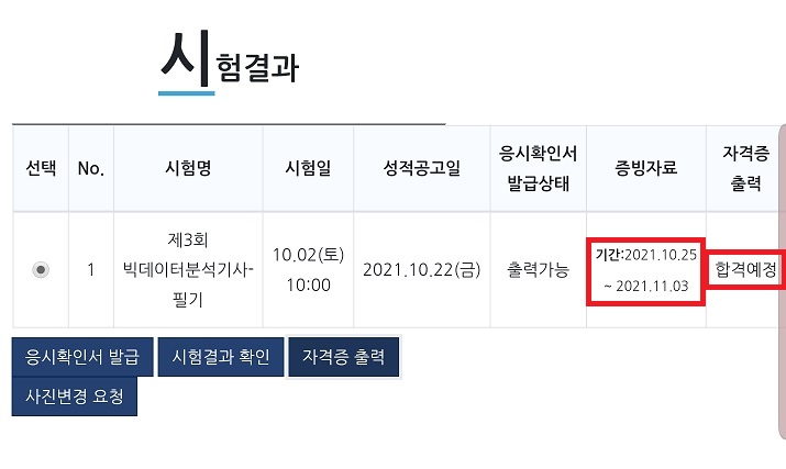 혹시나 시험 점수에 오류가 있지는 않을까 확인해보기 위하여 시험 결과 확인과 새로고침을 반복해보았습니다. 5분 정도 시간이 지나니 불합격으로 표기되어있던 것이 합격 예정으로 바뀌었고 증빙자료 제출기간이 나타났습니다. 시험 점수가 잘못된 것이 아니고 처음의 불합격 표기가 잘못된 것이었나 봅니다. 가채점 결과보다 너무 높은 점수가 나온 것이 왠지 찜찜하긴 하지만 일단은 합격이라고 하니 기분이 좋았습니다. (혹시 번복할까 봐 스크린샷도 여러 개 찍어서 저장하였네요)
