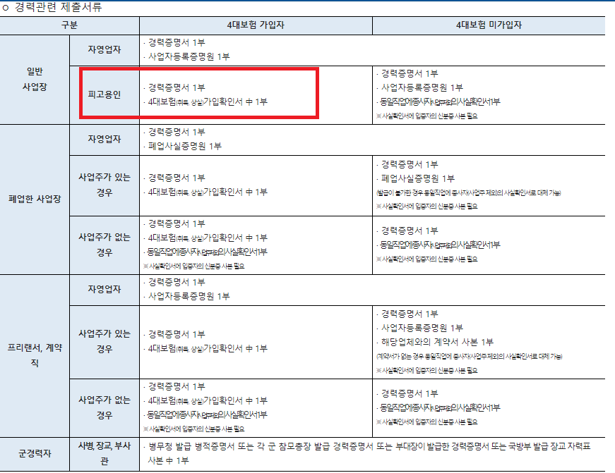 경력 관련 제출서류는 다음과 같습니다. 저는 일반 사업장의 피고용인으로 4대 보험에 가입되어있으므로 경력증명서 1부, 4대보험가입확인서 1부를 준비하였습니다. 저는 재직 중이므로 경력증명서 대신 재직증명서를 회사에서 발급하였습니다. 4대보험가입확인서는 4대사회보험 정보연계센터에서 간단하게 발급을 받을 수 있습니다. 공인인증서만 있다면 개인 비회원 로그인을 하여서 즉시 발급이 가능합니다.