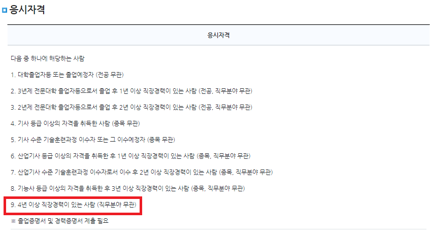 9) 4년 이상 직장경력이 있으면 응시할 수 있습니다.