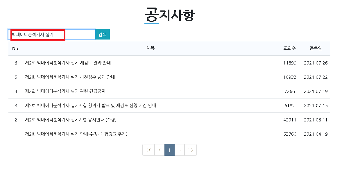 빅데이터 분석기사 실기시험이 34일밖에 남지 않았습니다. 긴장감을 가지고 퇴근 후에 바짝 준비를 해도 부족할 것으로 보여 걱정이 됩니다. 운이 좋게 빅데이터분석기사 필기 시험을 합격하였고 12월 4일에 실기 시험을 앞두고 있는 상황입니다. 필기는 단순 암기와 운으로 가능하였지만 실기시험을 운으로 합격하는 일은 없을 것으로 보입니다. 34일밖에 남지 않은 이 시점, 실기시험에 대한 정보를 알아보았습니다. 데이터자격검정 사이트의 공지사항에 '빅데이터분석기사 실기'라고 검색을하면 실기 시험에 대한 세부 정보를 확인할 수 있습니다.