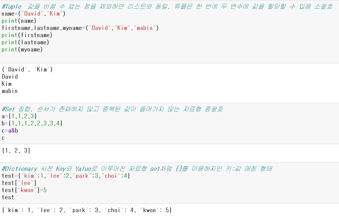 [1,2,2,4,"빅"] | (1,2,2,4,"빅") | {1,2,4,"빅} | {"A":1,"B":2} | 참과 거짓 True or False |