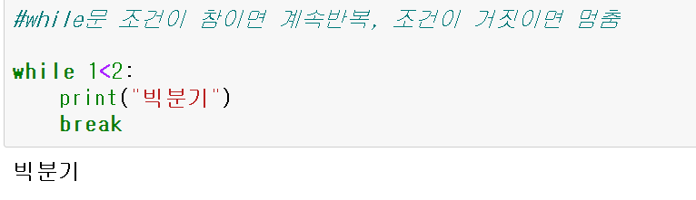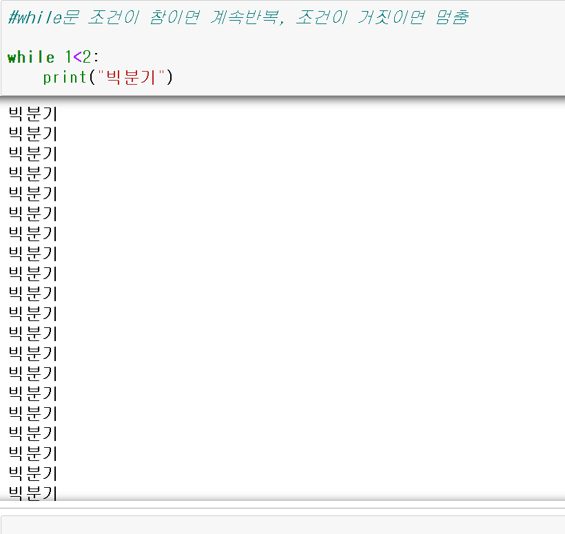 while문은 특정 조건을 만족할 때까지 계속 반복하는 문법. 조건이 참(True)면 계속 반복하고 거짓(False)이면 반복을 멈춤