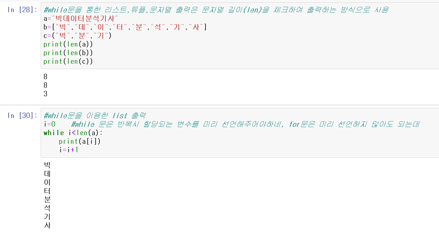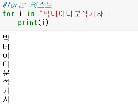 ->i에는 빅,데,이,터,분,석,기,사 가 차례로 할당되며 반복됨.